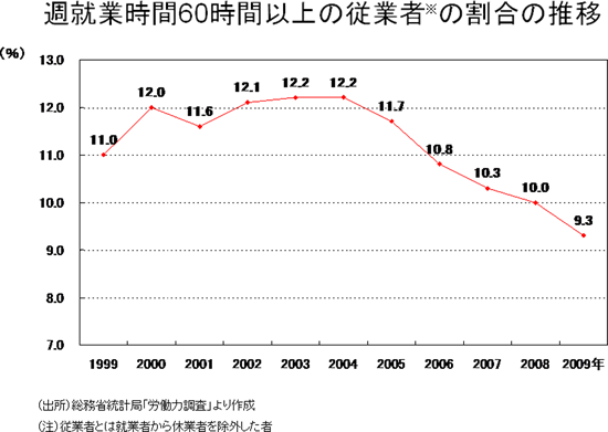 また、長労働時間も大きな課題の一つであります。週の就業時間が60時間以上の割合が、1割前後となっています。就業時間が週60時間というのは、一週間の残業時間が大体20時間程度、1カ月の残業時間が80時間程度に上っていることを意味しています。月の残業が80時間以上を一定期間続けていると、過労死する可能性があると言われています。そうした水準に達する人が、約1割程度日本にはいるということであります。
