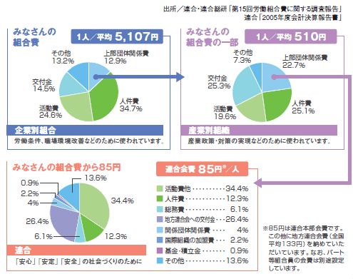 企業別組合の組合費の約13%が産業別組合の組合費で、1人平均にしますと510円となります。産業別組合は,産業政策の実現などのために組合費を使っています。企業別組合と数字は違いますが,使い道は同様となっており,産別組合費のさらに23%程が、上部団体である連合の組合費に充てられます。