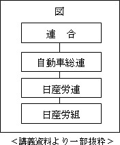 次に、日産労組の上部団体との関係について説明します。図をご覧下さい。一番下に日産自動車株式会社の労働組合である日産労組があります。そして、日産労組は日産労連という、販売会社や部品企業等を含めた日産グループとして各労働組合を集め活動をしている連合体の上部団体に加盟しています。さらに、日産労連は自動車産業全体のトヨタ自動車や本田技研工業を含めた各メーカー系列の労働組合の連合体で構成されている自動車総連に加盟し、そして、自動車総連は連合に加盟しています。連合を除くと、上から産業全体の連合体-メーカー系列グループの連合体-各企業の労組という、3層構造になっていることを理解してください。