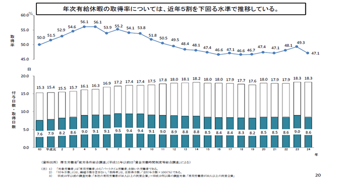 日本における年休取得率は50%を下回っています。年間に1日も年休をとらなかった者が16.4%、年休取得が5日以下の者が50%超となっています。年休が安心してとれる職場環境にしていかなければ、ワーク・ライフ・バランスの実現は理想でしかありません。経営者の責任は当然ですが、働く者の意識も変えていく必要があります。