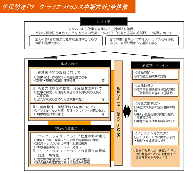 生保労連では、約10年前からワーク・ライフ・バランスの実現を取組みの柱に掲げてきました。そうしたこともあり、生保産業のワーク・ライフ・バランスは、かなり前進してきていると認識しています。ただ、その一方で課題も多く残されていることから、新たな中期方針を2014年8月に策定し、2020年を目標とした取り組みを現在進めているところです。