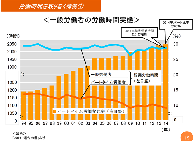 一方、正規労働者の総労働時間については減っていません。2014年時点の総労働時間は2012時間で、労働組合が目標とする1800時間を大きく上回っています。