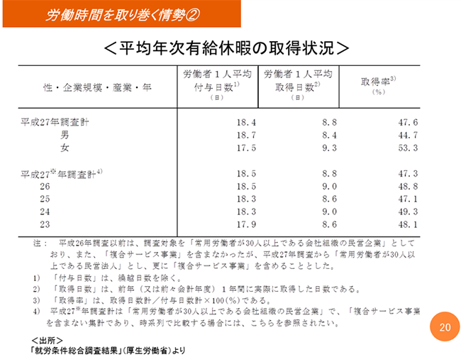 平均年次有給休暇の取得状況を見てみると、こちらも概して増えておらず、日数で9日前後、取得率で50%を下回る状況が続いています。この数値は、海外と比較しても低位にあり、政府の目標である「2020年までに取得率7割」からも遠い水準です。