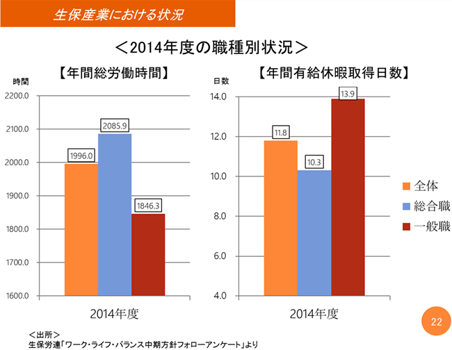 それでは、生保産業の現状についてお話ししたいと思います。2014年度で見ると、年間総労働時間が1996時間、年間有給休暇の取得日数が11.8日となっており、先ほど申し上げた全体の傾向よりは、目標に近い水準といえます。