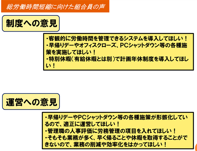 そして、課長・部長等の管理職の意識を変えることも含めて、社長から直接ワーク・ライフ・バランスのメッセージを発信してもらうことや、管理職の評価項目にワーク・ライフ・バランスに関連する指標を入れること、組合員の声を反映し業務削減・効率化に取り組むこと等を実現させた組合もあります。
