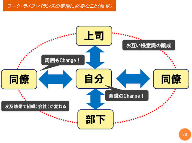自分の意識の変化が周りの意識を変化させて、お互い様意識が生まれます。休むのもお互い様、早く帰るのもお互い様です。そうすると、育児や介護に関わる人への配慮もできるようになるでしょう。こうしたお互い様意識が、ワーク・ライフ・バランスの実現には欠かせないものであり、必ず会社にも良い影響を与えます。私たち一人ひとりの意識が変わると、周りが変わり、組織が変わり、会社が変わり、最終的には社会が変わります。この意識改革が、ワーク・ライフ・バランスの実現に向けた大切なキーポイントであると私は思います。