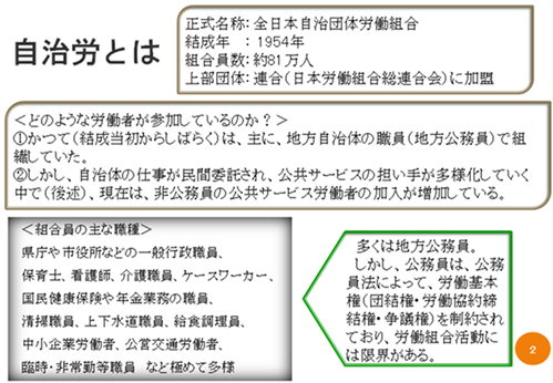 正式名称は全日本自治団体労働組合で、産別労働組合の一つです。約60年前に結成され、組合員は北海道から沖縄まで全国に約81万人います。昔は、主に地方自治体の職員、いわゆる地方公務員だけで組織していた組合です。今は地方自治体の仕事が民間委託され、公務員だけでなく民間労働者も働いており、このような公共サービスを担う非公務員の労働者も自治労の組合員となっています。組合員の仕事は、各都道府県の県庁、市役所、町役場の職員、市立保育所で働いている保育士、公立の病院で働く医師・看護師、清掃職員、市営バス・市営地下鉄などで働く公営交通労働者など様々です。
