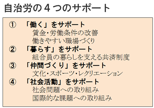 4つ目が「社会活動」をサポートすることです。自治労は、地域を守ることを使命とする地方公務員が多く集まっている組合です。地域を守るためには社会問題について考えていかなくてはいけません。さらには、平和でなければ地域の仕事も守ることができないことから、国際的な課題に対する取り組みなども行っています。