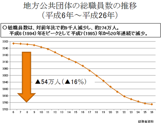 地方公共団体の職員数は、平成6年(1994年)から26年(2014年)までの推移を見ると、平成6年をピークに20年連続で減少しています。昔は330万人だったのがこの20年間で274万人まで減少しました。これだけの公務員の削減を行っていますが、一方で仕事量は増えています。国が行っていた仕事も今では地方にどんどん流れてきているからです。