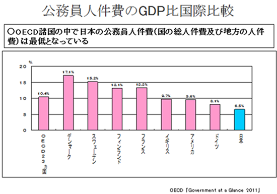 日本ではこのように公務員数が減っていますが、国際的な比較で見ると、日本の公務員の人件費は先進国の中でも非常に少なく、アメリカ(9.5%)よりも少ない6.5%となっています。社会保障が充実している国々であるデンマーク(17%)、スウェーデン(15%)、フィンランド(13%)は非常に高く、社会保障をしっかり整備していくためには、その担い手である公務員の人件費を増やしていくことが重要だということが分かります。