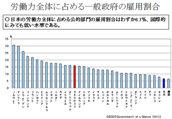 全体の労働者に占める公的部門の割合については、OECD32ヶ国での比較で見ると、韓国の次に低い水準にあります。全体平均の半分以下の割合にとどまっているのが現在の日本社会です。