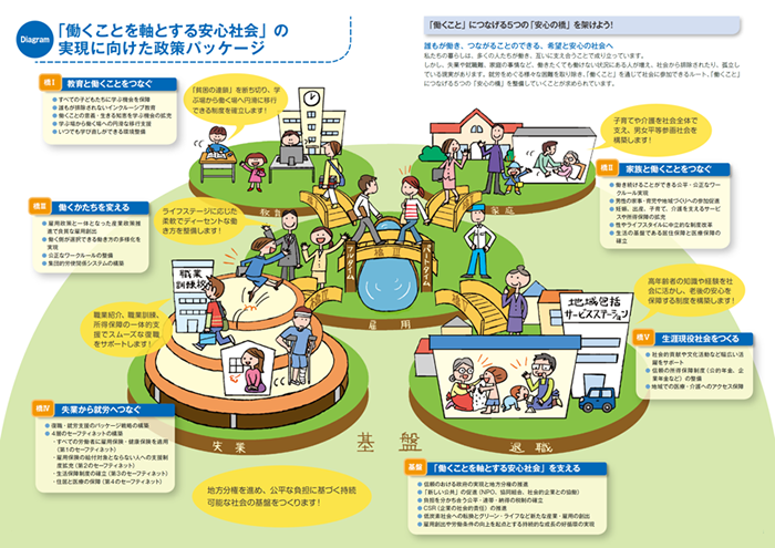まず、真ん中は「雇用」の島です。島の中に橋がありますが、これは正規雇用と有期雇用、派遣などいわゆる非正規雇用の行き来をイメージしています。この島では、雇用政策と一体となった産業政策を推進し、良質な雇用創出を目指しています。また、公正なワークルールの整備を通じて、働く側が選択できる働き方の多様化を実現していきます。同時に、労働組合などの集団的労使関係システムの構築をめざしています。