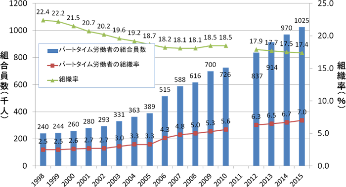 それから、雇用形態の変化によるものです。図表が示しているように、1998年から毎年、パートタイマーが増えています。今や、日本国内の総労働人口の4分の1を占める割合に上っています。彼らの組織化が遅れていることが大きな要因だと考えられます。