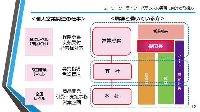生保の仕事を大別すると、営業の仕事および企画・事務等の仕事があります。前者は営業現場や支店の仕事で、後者は本社の仕事と考えていただければ良いと思います。私が経験した資産運用は企画・事務の仕事ですが、今日は営業の仕事における、総労働時間の短縮の話をします。と言いますのも、WLBについては社会的な要請の高まりがあり、組合も会社も力を入れており、本社部門はかなりWLBが進んでいます。ほぼ残業も無くなってきていますし、有給休暇も取れる環境が整ってきました。課題は営業現場の方です。今、生保労連も営業現場の総労働時間の短縮に取り組んでいます。中でも、個人営業の方にスポットを当ててお話します。