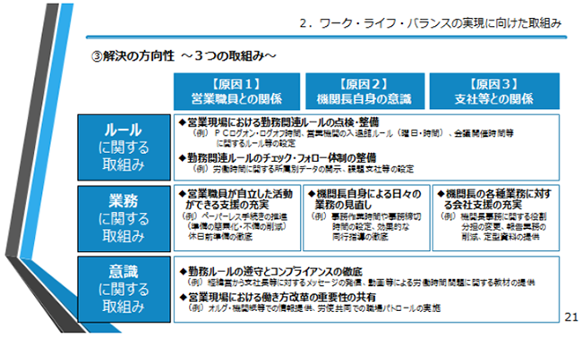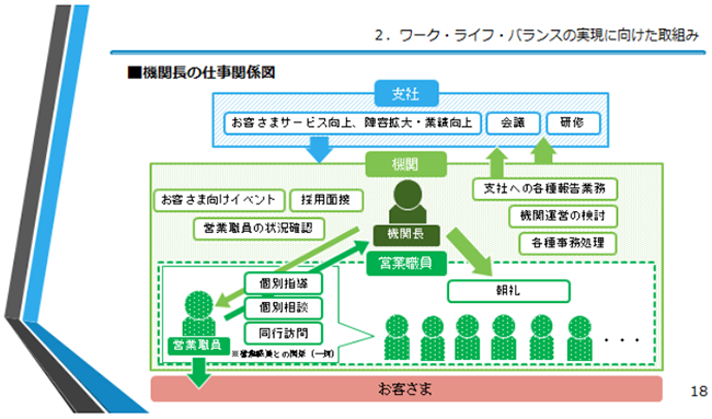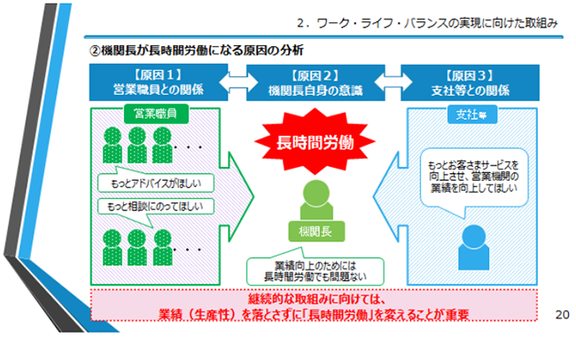 そのような中で、生保労連はまず、原因分析をしました(図表6)。機関長は営業職員から色々な相談を受けながらも、支社からは業績を上げて欲しい、営業職員の陣容を拡大して欲しいといった要請を受け、板ばさみになっている構図です。機関長には、長時間労働をしてでもそれらをクリアしないといけないという意識があるのではないか。そうであるならば、業績を落とさずに長時間労働という実態を変えることが重要です。