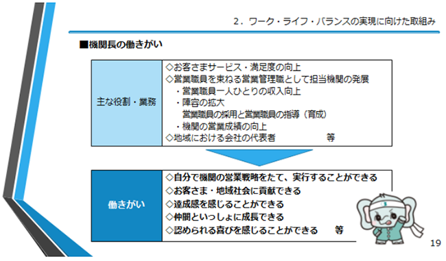 先ほどお話したとおり、機関長の長時間労働が最大の課題です。各営業機関には営業職員が約30名おり、機関長が統括しています。機関長の仕事は(図表4)、例えば、新商品の研修、コンプライアンス研修、個別指導等といった営業機関内の仕事のほか、支社向けの仕事もあります。一言で言うと、とても大変です。しかし、やりがい、働きがいもあり(図表5)、使命感を持って仕事をしています。営業職員は営業成績に伴う歩合給ですから、機関長は営業職員の生活の責任を負っているということになります。言わば、営業機関という一国一城の主(あるじ)なのです。中小企業の社長と同じような仕事をしていると言っても過言ではないと思います。早ければ20代後半で機関長に就きます。しかし、色々な業務を抱えているがゆえに、長時間労働になっているのが実情です。