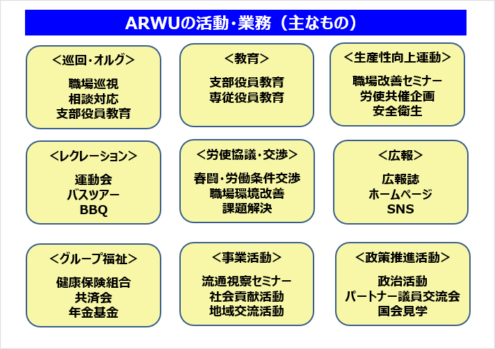 ARWUとしての主な活動としては、例えば、職場の巡回。働くうえで危険な箇所がないか、困っている人がいないか見回ります。また、非専従役員の教育。加えて、冒頭に「まる国」という活動を紹介しましたが、労使で生産性を上げることが労働条件を上げる鍵ですので、職場改善セミナーを労使共催で企画したりしています。職場のコミュニケーションも大事ですので、運動会などレクリエーション活動もしています。もちろん、春闘をはじめとする労使協議・交渉や、その他広報活動、福利厚生などもやっています。一番大事なのは、各店舗の生産性を上げることであり、そのために店舗で困り事がないようにすることです。