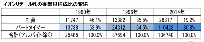 当社が発足した1969年当初は、パートタイマーがおらず正社員だけでしたので、労組員も正社員だけでしたが、そのうちにだんだんと世の中にパートタイマーが出てきました。当社でも、子育てが落ち着いて1日に4時間くらい働くという層が増えてきました。当社の従業員に占めるパートタイマーは、1990年は53.9%でしたが、1996年は64.5%、2014年には80.8%と、どんどん増えてきました。