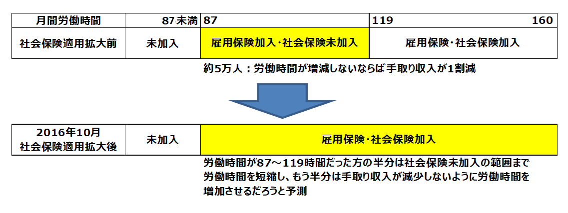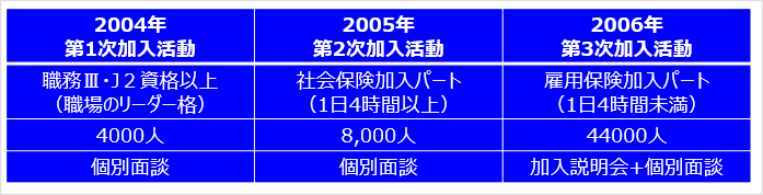 2016年には法改正で社会保険適用拡大があり、社会保険に加入しなければならない労働時間・収入要件が引き下げられました。この影響で組織率が下がるのではないかという予測を労使で立てました。つまり、パートタイマーの中には、社会保険に入ると手取り額が減るから、それを回避しようとして、社会保険・雇用保険に加入しなくても良い月87時間以未満にまで労働時間を下げる人が出てくるのではないかという予測です。そうすると、当労組の労組員の範囲は雇用保険加入者(月87時間以上)でしたから、これに伴って組織率も落ちて、従業員の過半数を割り込むではないか。そういう事態を防ぐため、もう一度、組合加入活動を行いました。
