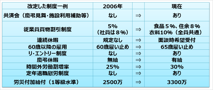 生産性向上のための主な労使共催の企画としては、政策発表会があります。これは元々、店長以上の会社側幹部だけでやっていたのですが、従業員も会社の政策を理解しないと上手く回らないので店舗の組合代表も参加させて欲しいと言ったのです。これを3年連続でやっておりまして、労使1,400名が一堂に会して、社長から直接、会社の方針を聞きます。また、労使共催レシートキャンペーンというのもありまして、従業員が店舗で買い物をしたら商品券が当たるというイベントです。正確ではありませんが、売上高への効果が年30億円くらいあるのではないかと言われています。