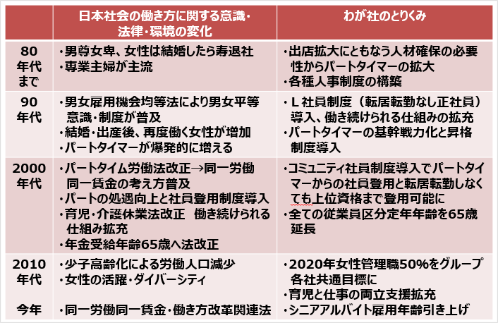 80年代の社会は男女の性別による役割分担意識が残っており、女性は結婚したら寿退社するのが当たり前でしたが、その後、子育てが落ち着いたらパートで働きに出るというのが主流で、パートタイマーが拡大しました。1986年に男女雇用機会均等法ができ、徐々に男女平等の意識が芽生えてきまして、当社でも結婚・出産後も働き続ける正社員女性が増えてきました。パートタイマーでもリーダー格の人がどんどん出てきましたので、女性が働き続けるための制度拡充や、そのステップアップ、処遇改善という課題がメインになってきました。2004年にパートタイム労働法改正があり、同一労働同一賃金という言葉も出てきたのですが、当社は先駆けてパートから正社員に転換できる制度を2004年にはつくっていたため、現在、5,000名くらいが正社員に転換して活躍しています。2008年には、パートも含む全従業員の定年を65歳まで延長しました。