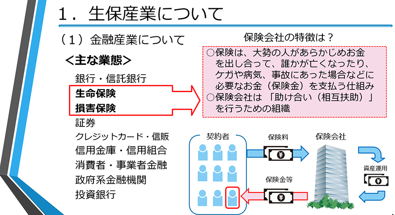まずは生保産業についてですが、保険業は金融業界の一つであり、大勢の人があらかじめ保険料を支払い、もし誰かが亡くなった時や、ケガや病気、事故に遭った時に、必要なお金を支払う仕組みを持っており、相互扶助の精神に基づいた制度となっています。
