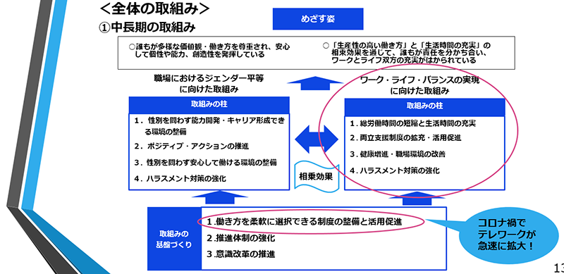 本日の具体的なお話の1つは、ワーク・ライフ・バランスの実現に向けて有効な取り組みである、コロナ禍で一気に広がった「テレワーク(在宅勤務)」について、もう一つは女性だけが家事・育児・介護を担当するのではなく、男性も参画できるよう、「男性の育児休業取得促進に向けた取組み」の状況についてお話しします。