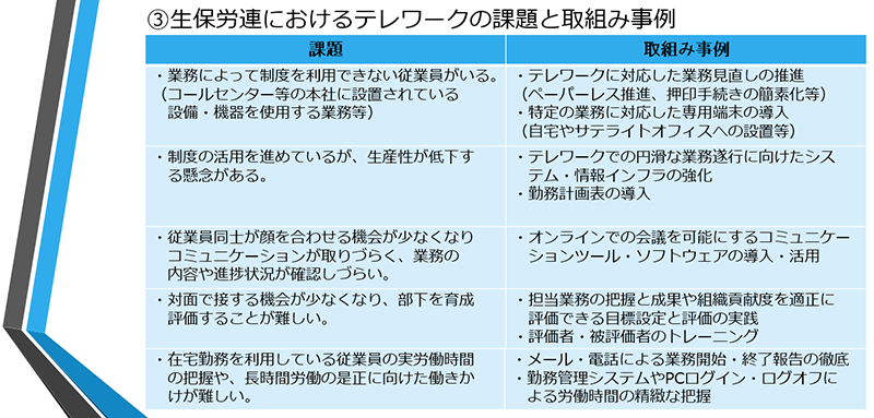 生保労連では、先ほどのデメリットを課題として取りまとめ、課題解決に向けた取り組み事例を確認しています。例えば、コミュニケーション不足に対しては、オンラインでコミュニケーションが取りやすくなるようなツールの導入を勧めたり、隠れた残業については、パソコンのログイン・ログオフの時間を記録し、労働時間管理を行ったりしています。