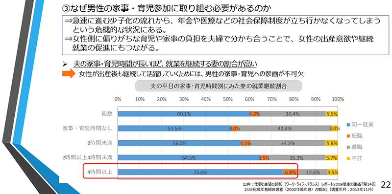 これまで育児休業を取得するのはほぼ女性だけでしたが、近年は政府の呼びかけにより、男性の育児休業取得を推進しています。厚生労働省のアンケート調査では、夫の家事・育児時間が長いほど、妻の就業継続率が高いという結果が分かりました。具体的には、夫が平日に4時間以上、家事・育児を担当すれば、妻の継続就業率は75%以上になります。つまり、夫が家事・育児を沢山しているほど、妻が仕事を辞めなくて済むということですね。逆に、夫が家事・育児を全くしていなければ、42.2%の妻が離職していることになります。女性が出産後も継続して活躍するためには、男性の家事・育児への参画が重要になります。