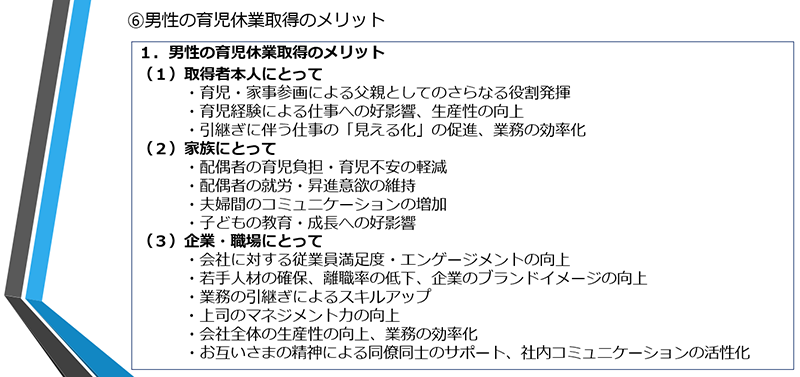 育児休業を取得した男性は、その後も、家事・育児に積極的に参画する傾向があります。父親が育児に積極的に関わり続けることが、子どもの教育や成長に好影響を与えるのではないでしょうか。会社にとっても、育児休業を取得しやすい職場環境であることは、従業員の満足度向上に繋がりますし、若手人材の確保においても大切な視点になると思います。男性が育児休業を取得するために業務の引継ぎを行う際には、無駄な業務を見つけることができる等、副次的な効果もあって、会社の業務効率化にも繋がります。