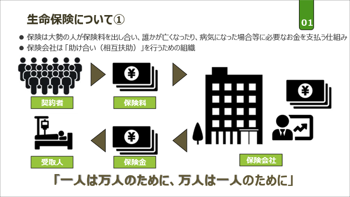 まず、そもそも生命保険というのは、ご契約者の方々から保険料を頂いて、その保険料を生命保険会社の方で各種運用をして、ご病気になられたり、お亡くなりになった時に、運用した保険料から保険金を受取人様にお支払いするというような仕組みになっています。