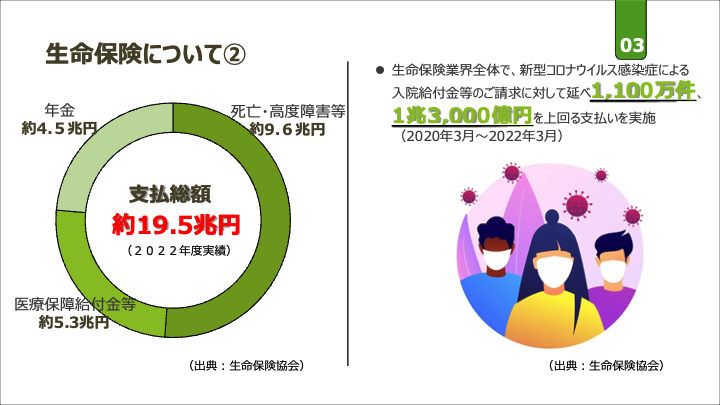 左側の円グラフですが、こちらは2022年度の支払い実績で、保険金や給付金、年金等を合わせて約19.5兆円をお支払いしております。2024年度の国の社会保障関係予算というのが37.7兆円になっており、公的保障と言われる社会保障に対して、私的保障と言われる生命保険も大きな役割を担っているというところをご理解いただければと思います。