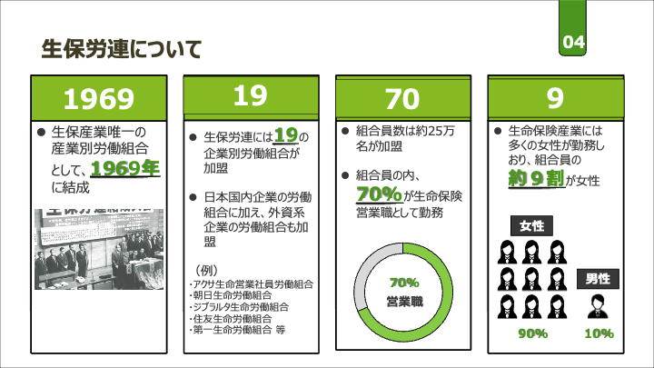 まず1つ目の1969というのは、生保労連が結成された年になります。私も生まれる前ですが、この1969年はアポロ11号が月面着陸した年です。次の19という数字ですが、こちらは生保労連に加盟している企業別労働組合の数になります。具体例として、いくつかの会社名を載せていますが、生保労連に加盟している組合というのは、日本国内の企業の労働組合に加えて、外資系企業も含まれています。次に70という数字は、生保労連に加盟している組合員は約25万名が加盟しており、そのうちの約70%が生命保険の営業職として勤務されている方になります。次に9という数字です。生保産業には多くの女性が勤務しておりまして、全組合員のうち、約9割が女性となっています。