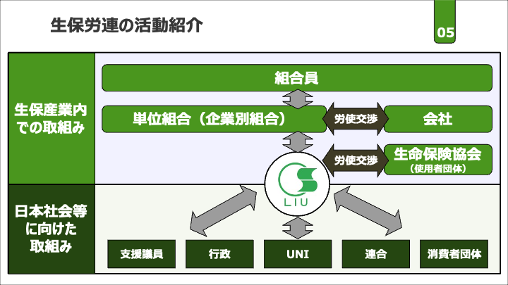 図表4は生保労連の活動紹介になります。真ん中にLIUと書かれているのが生保労連になります。そもそも労働組合というのは、組合員の日々の活動を支えて、組合員の処遇や、労働環境の維持や改善のために活動している組織になります。生保労連に加盟している労働組合というのは、それぞれ自分たちの会社がありまして、会社に対して春闘というもので賃金の交渉を続けております。最近は新聞でも春闘とか賃上げというような言葉が出てきているかと思いますが、これは各企業別組合が会社と労使交渉を行うことで、何%ベアを勝ち取ったとか、そういったところになります。また、賃金だけの交渉ではなくて、例えば、もっと休暇を取りやすくしてくださいとか、労働時間を縮減するように会社の方からも何か働きかけを行ってくださいというような申入れも労使交渉で行っております。この労使交渉というのは企業別組合だけではなくて、生保労連も行っておりまして、その相手というのが生命保険産業の代表組織となる生命保険協会というところになります。生命保険協会との労使交渉では、生保産業全体の課題について労使交渉を実施しております。これが生保産業内での取組みとなります。