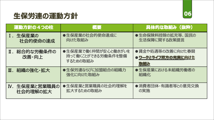 図表5は生保労連の運動方針です。大きく4つの柱で構成しております。その中で私が担当しているのが、上から2つ目の柱「総合的な労働条件の改善向上」です。具体的な取組みのところで、少し分かりやすく記載していますが、賃金とか処遇などの改善に向けた春闘というところと、ワークとライフ双方の充実に向けた取組みというところで、休みの取りやすさや労働時間の縮減、両立支援制度をより使いやすくする等の取組みを担当しております。
