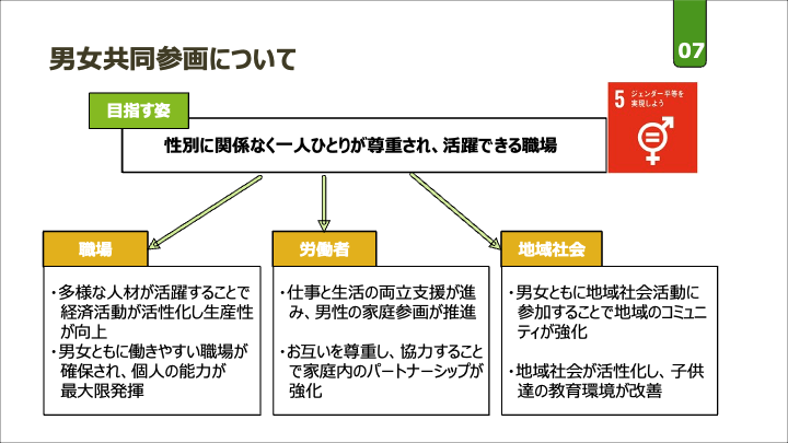 まず、男女共同参画から少しお伝えしたいと思います。男女共同参画の取組みでは、「性別に関係なく、一人ひとりが尊重されて活躍できる職場」というのを目指す姿としており、こちらはSDGsの17個の目標の1つである「ジェンダー平等の実現」にも関わってくる取組みだと思います。男女共同参画を進めることで、職場と労働者、地域社会それぞれに利点があると考えております。まず、職場については活気が溢れてきますし、労働者自身にとっては家庭生活が充実してきて、地域の方でも地域力向上につながっていきます。そうすることで、男女ともに夢や希望を実現して、一人ひとりの豊かな人生につながっていきます。