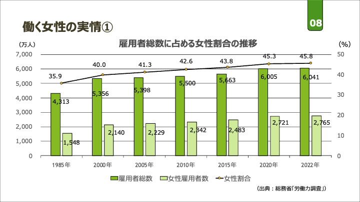 約40年前の1985年から比べますと、働く女性は約1200万人増えており、雇用者総数に占める女性割合も10%増加ということで、40年前から比べると、かなり女性の社会進出が広がっていることが分かるかと思います。
