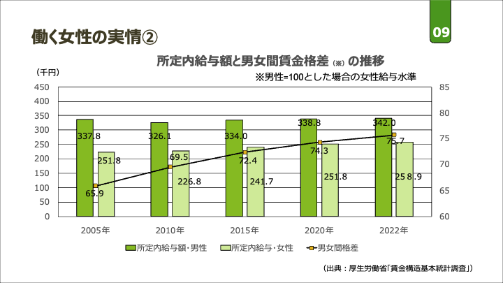 働く女性が増加したことで、給与面はどうなっているのかというのが、図表8になります。濃い緑が男性の所定内給与を示しており、薄い緑が女性の所定内給与を示しております。そして、折れ線グラフが男女間賃金格差、つまり男性の給与を100とした場合の女性の給与水準を示しております。男女間賃金格差の折れ線グラフを見ていただくと、この17年間で男女間賃金格差は9.8ポイント改善していて、直近の2022年度では75.7にまで改善していますが、OECDの平均は87.9ということで、諸外国に比べると、日本の男女間賃金格差はまだまだ大きいです。なぜ、この男女間賃金格差が広がっているのかというと、その理由としては勤続年数やコース別採用、管理職登用率が挙げられております。また、ライフイベントによる休職や退職というのは女性の割合が高く、性別役割分業意識というのも影響が考えられます。