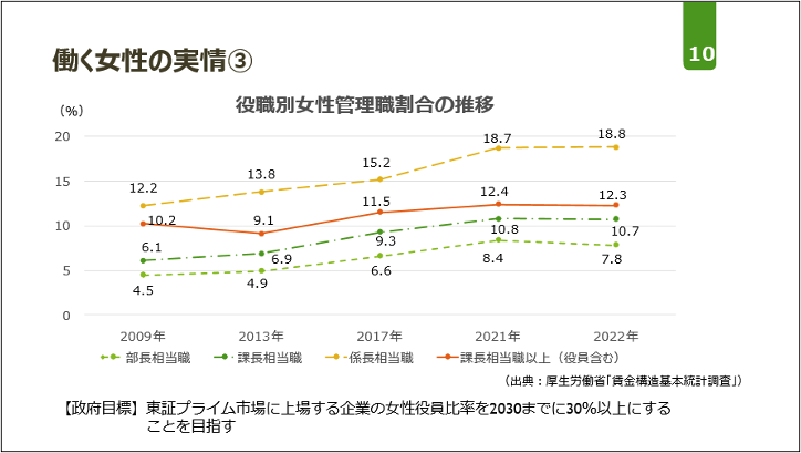 課長以上の管理職割合は急に増やすことはできないので、まずは候補者となりうる女性の係長の比率を上げていき、その係長が増えることによって、課長候補者が増えていき、それがゆくゆくは課長の推移も増えていきます。東証プライム市場に上場する企業で、女性役員比率は2030年までに30%以上にするというのが政府の目標にあります。この課長職以上の管理職というのは基本的に課長以上を見ているので課長以上である赤い折れ線グラフが2022年で12.3ということはこれからも積極的に登用していかないと中々ここが上がっていかないのかなというところになります。