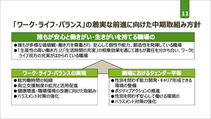 ここからは男女がともに働きやすい職場づくりに向けて、生保労連でどういった取組みをしているのかというところをご紹介したいと思います。図表10は生保労連における「『ワーク・ライフ・バランス』の着実な前進に向けた中期取組み方針」で、2021年1月から2025年8月までを取り組み期間として掲げております。目指す姿を「誰もが安心と働きがい、生きがいを持てる職場の実現」として、具体的に、どのような職場かというと、1つに、「誰もが多様な価値観・働き方を尊重され、安心して個性や能力、創造性を発揮している職場」であり、もう1つが、「『生産性の高い働き方』と『生活時間の充実』の相乗効果を通じて誰もが責任を分かち合い、ワークとライフ双方の充実がはかられている職場」になります。