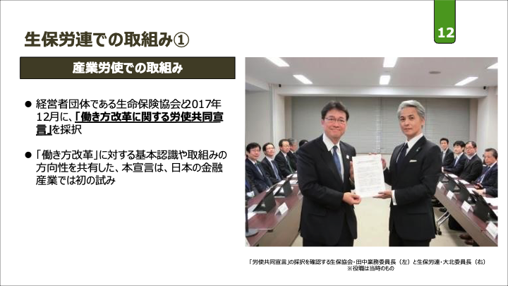 この採択の後、2019年に働き方改革関連法案というのが施行されておりまして、時間外労働の上限規制として、月45時間、年360時間と制定されて、年次有給休暇の取得義務化なども制定されていますが、この法改正に先立って、労使で共同宣言を採択できたというのは、かなり先進的で重要な意義があると考えております。この採択でどのようなことを期待していたのか、少し内容をお伝えしたいと思います。近年、労働力不足が深刻化する中において、より魅力ある産業・企業づくりを進めて、多くの人材を育てることができれば、生保産業の持続的安定的な発展につながると思われます。具体的には、女性や高齢者、LGBTQ、障害者、外国人など多様な人材が活躍できる環境の整備や、ワーク・ライフ・バランスの実現に向けて、労使で力を合わせて取組みを進めるといった内容を採択しております。