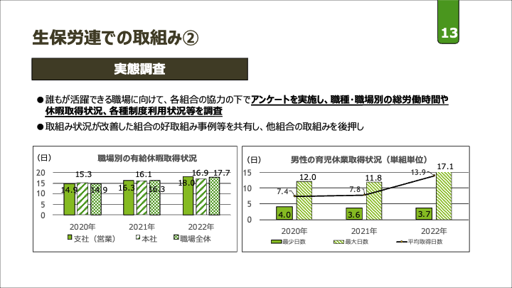 続いては、誰もが活躍できる職場に向けて、各労働組合の協力のもとで、生保労連では毎年アンケート調査を実施しております。このアンケートを通じて、職種や職場別の労働時間や休暇取得状況、両立支援制度の利用状況を調査しております。図表12の左のグラフは、職場別の有給休暇の取得状況ということで、営業現場である支社と本社、職場全体で、過去3年間で有給休暇の取得状況がどうなっているかを示したものになります。