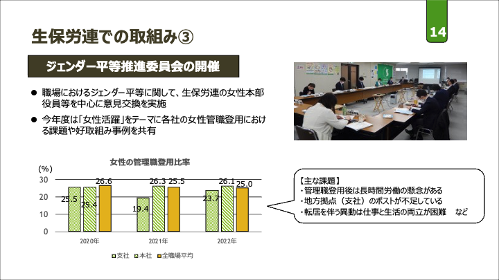 今年度は女性活躍をテーマに意見交換を行っております。図表13に女性の管理職登用比率をお示ししております。女性の管理職というのは課長以上である管理職がどれぐらい登用されているかということですが、一番左から支社での管理職、真ん中が本社、一番右側が職場全体ですが、過去3年間見ていただくと、横ばいになっています。あまり女性管理職登用比率は伸びていないことが分かりますが、それがなぜなのかというのを、ジェンダー平等推進会のメンバーで検討していて、数字が伸びている会社があれば、どんな取組みをしているのか、他方で、何が原因で女性管理職になりたい人が出てこないのか、そのような課題に対して、どんな対応策があるのかというのを検討しています。
