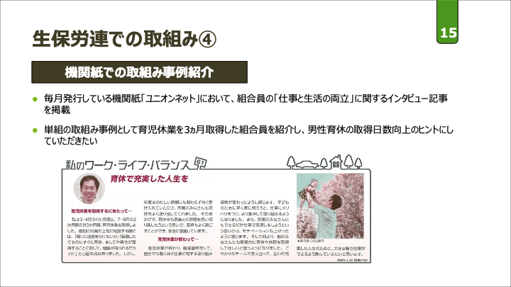 続いては機関紙での取組み事例ということで、生保労連では毎月、機関紙ユニオンネットというものを発行しております。この機関紙では、組合員の仕事と生活の両立に関するインタビュー記事を載せており、図表14は、その抜粋になります。男性の組合員で育児休業を3か月取得された方のインタビュー記事を載せております。この他にも、例えば、男性育休ではなくて、労働時間の縮減に向けた取組みということで、他産別である損保業界で取り組んでいる労働時間縮減の取組みを紹介することで、組合員の労働時間縮減の意識醸成を図っております。ここまでが、生保労連での取組みになります。