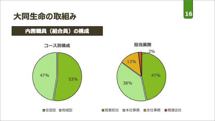 まずは大同生命がどういった会社なのかをお伝えしたいと思います。大同生命の内務職員の組合員は約2800人います。その中では全国転勤をする全国型と、私のように地域を限定して勤務する地域型という2つのコースがあります。大同生命の中では、全国型が少し多い53%を占めています。