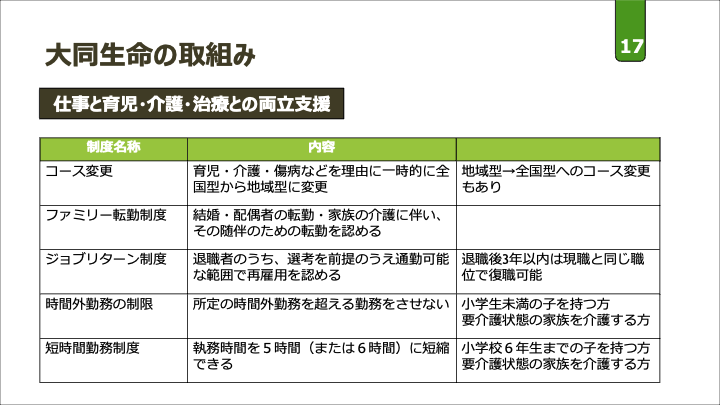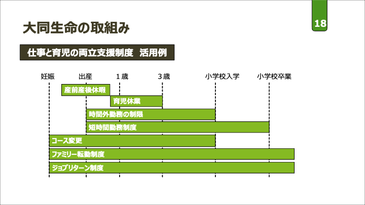 図表17は両立支援制度の活用例としまして、仕事と育児の両立支援を例としてグラフにまとめております。この中でも、例えば育児休業ですが、法令上はお子さんが1歳までを対象としております。ただし、法以上の対応として、大同生命では3歳までを対象としております。このような制度を利用しながら、仕事と育児を両立されている方がどんどん増えてきており、最近では短時間勤務制度を利用しながら、係長として部下の育成をしながら業務をされている方も増えてきております。
