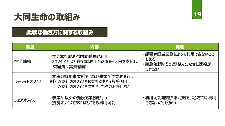 図表18は働く場所を問わない柔軟な働き方に関する取組みを紹介していきたいと思います。まず一番上の在宅勤務ですが、在宅勤務はもともと育児や介護との両立支援のための制度でしたが、コロナ禍を契機に、すべての従業員が利用できるようになっております。サテライトオフィスやシェアオフィスというのは、自宅や事業所以外で業務できる場所が提供されたというものになります。この中でも、特にシェアオフィスというのが従業員の中からは好評で、例えば、営業担当者が次のアポイントまでの時間を使って仕事をする時は、一度支社に戻る必要がありました。その場合は移動時間がかかり、仕事が全然進まないといった声もありましたが、今、自分がいる場所の近くにシェアオフィスやサテライトオフィスがあることで移動時間が短縮できるというような利点があります。また事務担当者でも、ご自宅に在宅勤務の環境が整っていないような状況でも、自宅近くでシェアオフィスがあれば利用でるので、通勤時間が省略できるということで、移動時間が短縮できて、効率が良くなったという意見が多く聞かれております。