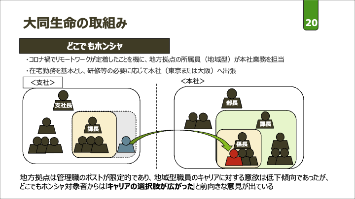 図表19は在宅勤務を活用した、「どこでもホンシャ」という取組みの紹介です。どういったものかというと、地方の支社事務担当者が本社の所属として、本社事務を経験するものです。配属直後は、本社の事務に関して全然分からないので、1か月とか2か月は本社へと出張し、業務を習得した上で、習得後は自宅に戻り、基本的には在宅勤務を使って、本社業務をするというものになります。どこでもホンシャというのは、昨年度2023年から運用を始めており、今年度の対象者は26人いらっしゃいます。これまでは、東京と大阪それぞれの本社から通勤できる人しか、本社事務はできませんでした。全国型の場合は全国転勤があるので、本社で仕事をすることもできますし、支社での営業とか事務を経験することができますが、特に地方の地域型の方は、所属する支社のお仕事しかできないので、担当する業務が非常に限定的になります。