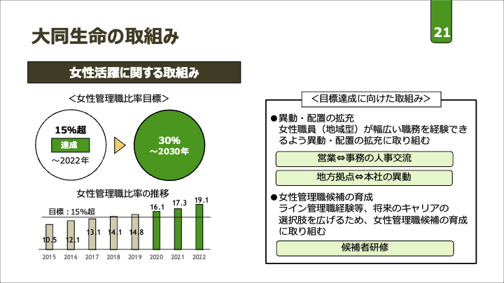 次に、大同生命の女性活躍に関する取組みをご紹介したいと思います。当社では、2022年までの女性管理職比率の目標を15%としておりました。この15%ですが、女性管理職比率のグラフを図表20にお示ししている通り、2020年に達成しており、2023年から新たな目標を掲げています。その目標というのが2030年までに女性管理職比率を30%にまで引き上げるというものです。