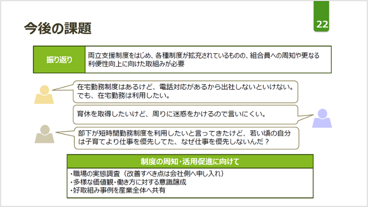 今後の課題ということで、これまでの話を振り返っていきたいと思います。男女がともに働きやすい職場作りに向けては、両立支援制度などの拡充や整備というのはどんどん進んでいるかと思いますが、組合員が全ての制度を把握できている訳ではありません。そのため、労働組合の役割としては、色々な制度を組合員に周知していくこと、その上で、より利用しやすい制度となるように、会社側と交渉していくことだと考えております。